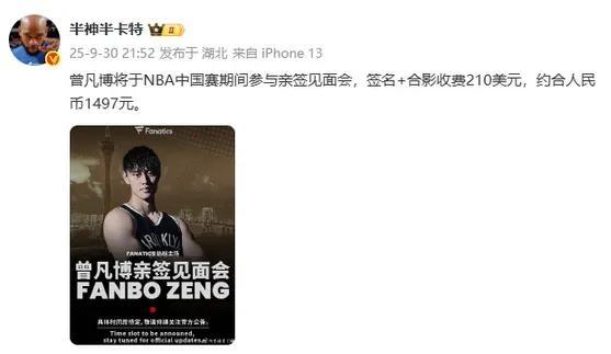 媒体报道,届时NBA中国赛期间,中国球员、篮网前锋曾凡博将参与亲签见面会。球迷可以近距离接触球员,并得到签名合影,但收费高达210美元,折合人民币约1500元。